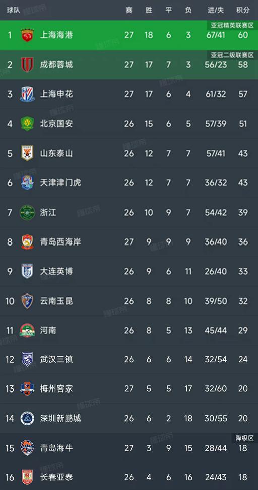 北京时间10月18日,昨晚随着上海海港4-3青岛海牛,成都蓉城3-1梅州客家,上海申花2-1青岛西海岸的比赛结束,中超第27轮结束了三场比赛,最新积分榜如下!